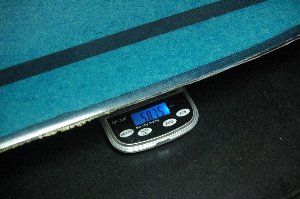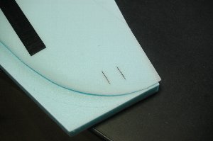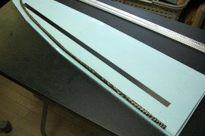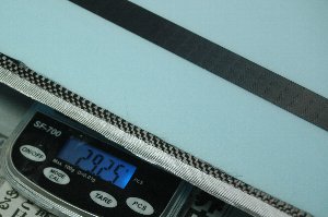 今回は、Dボックス構造にせず、カーボンキュアシートのスパーを入れます。カーボンキュアシートは巾15ミリ深さ0.15ミリ。 スチール定規でコアを潰すようにしての溝を作り、カーボンキュアシートをエポキシ接着剤で接着します。(仕上がり時に段差ができないように) カーボンキュアシート接着後重量26.6gとなりました。 1本で1.5gです。 |