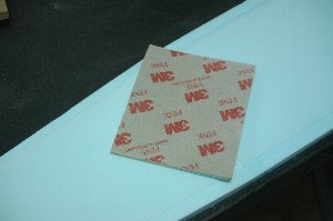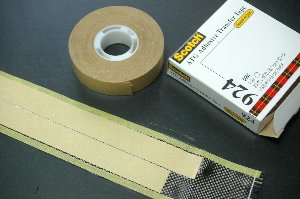 前縁にカーボンを貼りつける準備。 3M 機材なし極薄両面テープ924(巾20ミリ) を貼付けてカーボンテープを作ります。R/C Webshop kbさんで販売されています。 |