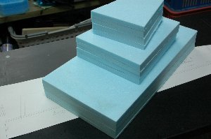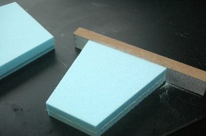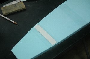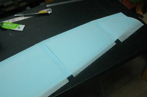 コアの接合が終わったら、接合部が滑らかになるようにサンディング。 3Mのスポンジペーパー「ファイン」(#240〜#320)を使用しています。 翼型の曲面に沿って削ることができるので重宝しています。 |