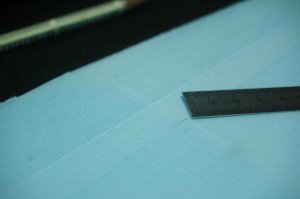 ハードポイントを作る為のカットを入れておきます。 (今回はウイングスパンを縮めますので、バギング後に中央40ミリはカットします) |