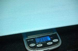 ここで、スパンを縮めます。中央部を40ミリカット。 これでウイングスパンが80ミリ短くなり、面積が1.44dm2小さくなります。主翼面積はおおよそ20dm2位かな。 カットした主翼重量を量ってみると、なんと左右で9gです。これで主翼重量は9g軽くなり、110g位となります。 |