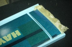 5センチピッチでメッシュラインが入ったガイドボードの上に載せてバイアスにカット。 カットしたアラミドクロスは織り目が乱れないように巻き取って保管しておきます。 |
