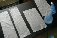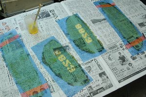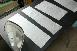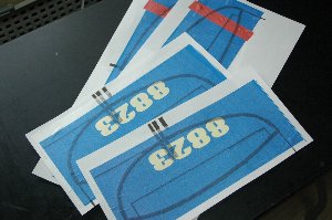 無地のシルクにプリンタでデザイン印刷。今まで難しかった文字入れを、重量を増やさずに行うことができます。 シルクに55スプレーを吹いてコピー用紙に貼り付けます。コピー用紙には予め尾翼のラインをプリントしておき、プリント範囲の目安にし、コピー用紙ごとプリントします。 尚、プリンターの用紙送りのゴムローラーにシルクがかかると用紙送りが正常に行われません。Canon iP4500の場合、右から5センチ位のところにゴムローラーがありますのでこの部分は避けてシルクを貼ります。 |
