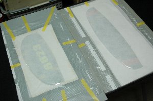 プリンターのカラーは半分位は台紙に抜けてしまい、思ったより淡くなりました。少し濃い目にプリントする必要がありそうです。 主翼とのカラーコーディネートの為、エポキシ樹脂にはプリンタインクのイエローを数滴混ぜています。(主翼はアラミドのイエローの影響で黄味がかっていますので) バックプレートにはクリアフォルダを使用。ワックスを塗らなくても離型できますので、最近はこれに切り替えました。 |