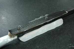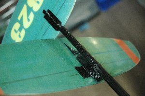 尾翼をカーボンで補強 水平尾翼:尾翼と台座、台座とパイプ パワーランチで吹っ飛ぶ部分・・このあたりを念入りに補強しておきます。 この部分で尾翼が折れる、もしくは吹っ飛ぶ事故には自分の機体も含めて何回も遭遇しています。 |