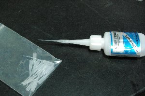 もうひとつ必要な道具:瞬間接着剤の延長ノズル。 マイクロカーボンパイプに沿わして瞬間を流し込み、マイクロカーボンパイプをパイプ内に固定します。 (R/C HOBBYさんでOKボンド用ノズル として販売されています) |