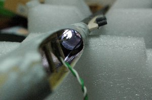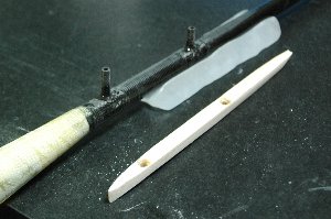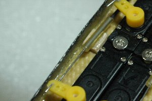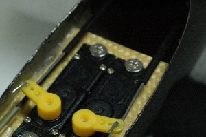 エレベーター/ラダーリンケージ:サーボ側の取り回し・・マイクロカーボンパイプの口は割れ易いので、内径1.2ミリのPPパイプを15ミリ程に切って被せます。 このPPパイプを台座のバルサ材に接着固定します。こうしておくとメンテナンスで外す必要がある際もマイクロカーボンパイプに傷をつけず簡単に外せます。それから、台座のバルサ材は低粘度の瞬間接着剤を吸込ませて固めておきます。こういしないと経験的にバルサ材が破断します。 それから、初心者の方の為に・・サーボホーンの穴の内径は1ミリ近くあり、0.4ミリのステンレスを差込むと遊びが出ます。リンケージ終了後に穴に低粘度の瞬間接着剤を流し込むことで隙間を埋めます。 |