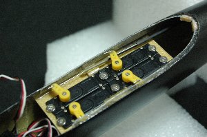 エルロンリンケージ:サーボ側の取り回し・・エルロンリンケージには外径1.5ミリ内径0.7ミリのマイクロカーボンパイプと0.6ミリピアノ線の組合せ。 この組合せは短い距離ならかなりしっかりしているので固定は (5枚上のLEDライトで照らしている写真参照) |