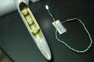 マイクロカーボンパイプをパイプ内に内装する際、必要な道具:LEDライト。 高輝度のLEDを1Sリポに直結。パイプの中を照らしながら、作業をします。作業といっても、低粘度の瞬間をマイクロカーボンパイプに沿って流し込むだけですが・・ |