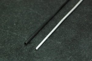 リンケージには、マイクロカーボンパイプ(外径1mm×内径0.5mm)と0.4ミリ ステンレス伸直線を使用します。 いずれもクラフトるうむさんより発売されました。 左写真はエレベーター用の取り出し部。マイクロカーボンパイプの端部は割れやすいので、シュリンクチューブを被せてシュリンクさせておきます。 |