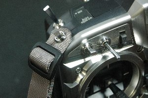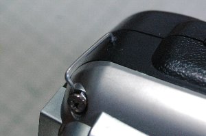 左肩のスイッチに挟み込みました。 でも、これでは左人差し指が自由に動かないのでランチモードスイッチ(左肩奥のバタフライスイッチ)をうまく操作できません。 |