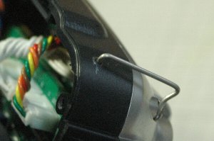 プロポのケースに1.5ミリの穴を明け、ピアノ線のクランクを差し込みます。(写真は下後ろから撮影しています。) プロポを傷つけるのはこの穴のみです。この位の穴なら後から埋められます。 |