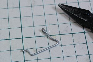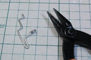 1.2ミリのピアノ線を左の写真のように細工します。 片方はクランク、片方はリング形状にします。 |