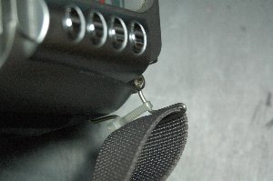 ピアノ線のリング側を元ネジに挟み込んで固定して完成。(写真は下前から撮影しています。) これでかなりしっかりした金物となりました。 ところがホルダーベルトを取り付けてみると左手の第三関節にあたってしまい、うまくありません。 |