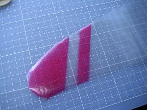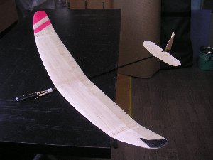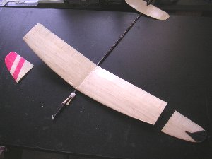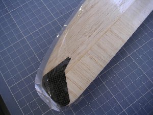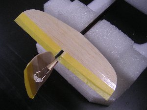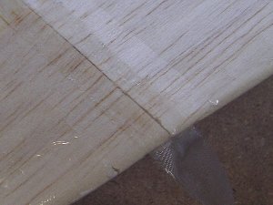 翼端から10センチのところでカット。 なんだか痛々しいですね。 10センチに対して2.5センチの上半角がつくように削り合わせてから、接合部にリブを詰め込みます。接合部のフィルムは剥がしておきます。 |