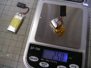 マイクロデジタルサーボをホビキンから取り寄せる際、 70mAhリポも同時に取り寄せました。 重量はコネクター込みで2.5g。 左に置いてあるのが100mAhなのでかなり小さいです。100mAhリポの重量は3.5gでしたので1g軽くなります。 |