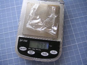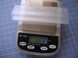 材料ストックの引き出しから軽量フィルムを探し出します。管理人本人もなにがあったのか正確には覚えていません(;^_^A クラフトるうむの”ウエットフィルム”と 早速重量を量って見ます。クラフトるうむの”ウエットフィルム”は1dm2あたり0.43g。 |