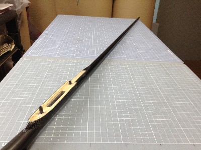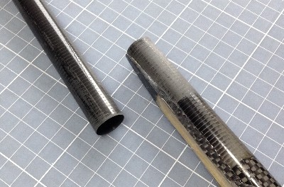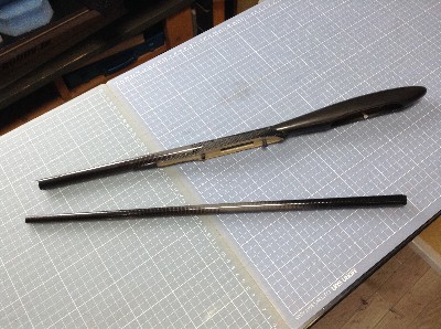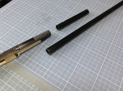 新しいパイプを上から被せます。 重量増を重心に近づけるためになるべく主翼に近いところでジョイント。被せしろは50〜60mm。 被せる側の新しいパイプの摺り合わせ、寸法出しはかなり微妙ですので慎重に。 |