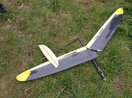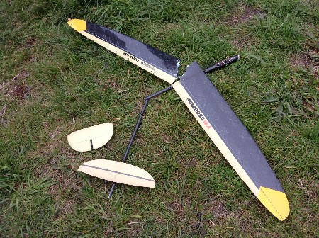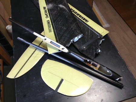 完成したばかりの機体がノーコンで墜落。 かなり派手な墜落でした。ほぼ垂直降下、よりによって土手のコンクリート法面に激突。 なぜノーコンになったかは、ここではさておいて。 損傷状況は 主翼は真っ二つ、ノーズは陥没、ブーム骨折etc・・・かなりの重傷。 でも激突があまりに激しかったせいか各パーツはキレイな状態。