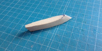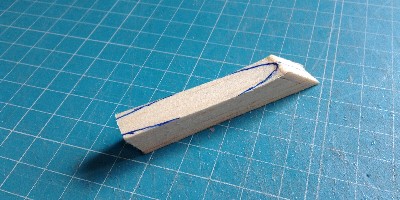 台座の製作。以前はスタイロコアを使用していましたが、扱いやすいので最近はバルサを使用しています。 10mmバルサより外形切り出し。この時点で尾翼の翼型にあわせて尾翼取り付け面を削っておきます。 |