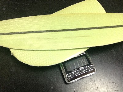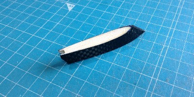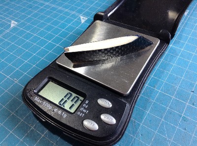 カーボンクロスを瞬間接着剤を用いて貼り付けます。 この造形、3次元なので5052樹脂を用いてカーボンクロスを貼ろうとすると結構大変です。 その点、バルサだと瞬間接着剤が使えるのが良いです。 |