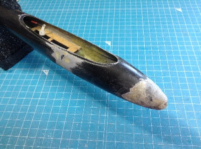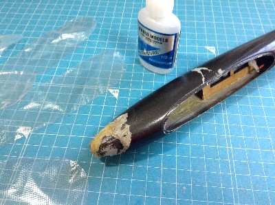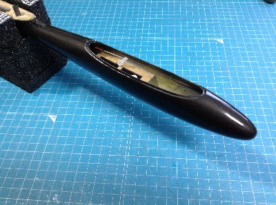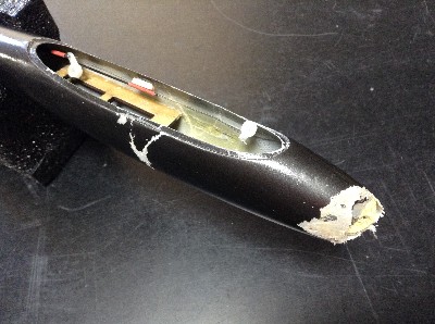 真っ逆さまに落ちたせいでノーズがかなり陥没しています。 サーボベッドは半分から後ろは使えそうなので前の部分を取り除いてあとから付け加えることにします。 PODはアラミド+ガラスクロスでできています。ガラスクロスは衝撃で割れてしまいますが、アラミドはそう簡単には破断しません。 陥没部分を内側から押し戻してやります。 |