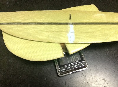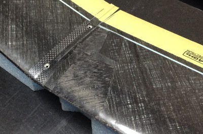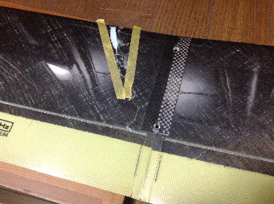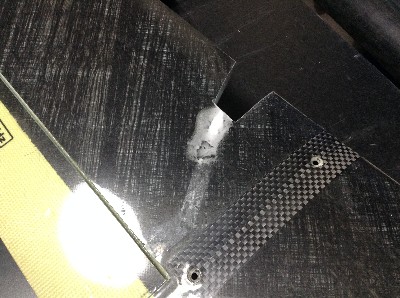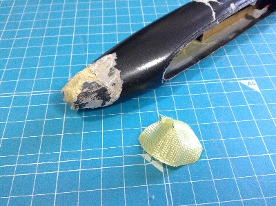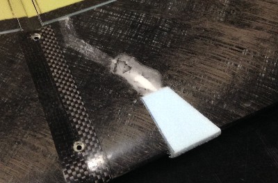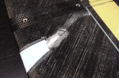接続が終わったら 1)陥没がない部分は上からグラステープで補強します。 2)陥没部分はマイクロバルーンを混ぜたエポキシ樹脂で充填します。 3)前縁に近い側は座屈が激しいので切除じて新しいコアに入れ替えます。 |