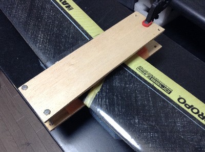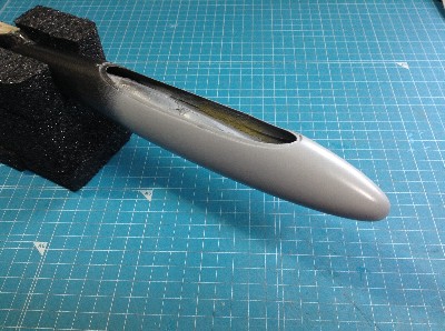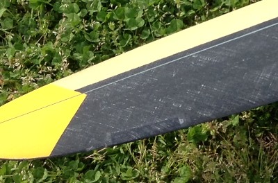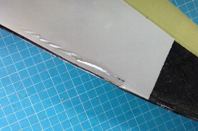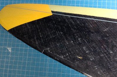 前縁部分が座屈して陥没しています。 バリを削り落とした後、コアを指でなるべく復元した後に、コアが咲くている部分に5052エポキシ樹脂を流し込んで固めます。 硬化後、陥没部分を軽量パテで埋め、仕上げはラッカーパテ。 サンディングの後に再塗装しました。 |