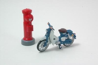 赤い郵便ポストとのツーショットがなぜか似合います。ホンダスーパーカブは1958年の発売以来、今でも基本デザインは変わっていません。