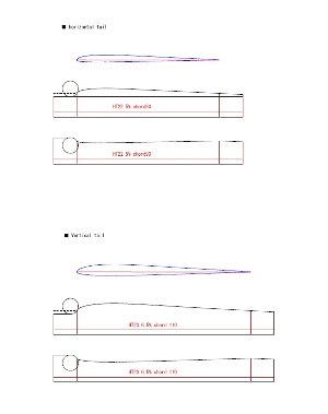 この値をひとつの基準として比較してみると良いでしょう。 ---------------------------------------------------------------------------------- そこで主翼前縁から水平尾翼前縁までの距離を代用値として把握するのもよいでしょう。 上に示したSALpeteは670ミリです。 ---------------------------------------------------------------------------------- ■水平尾翼の翼型 管理人はSuperGeeで採用されているHT22を使用していますが、 経験的に、極端なことをしなければ翼型の違いによる大きな影響は無いと思われます。 ---------------------------------------------------------------------------------- ■水平尾翼の平面形 平面形の違いによる影響をまだ試した事はありません。今後の検証課題です。 ---------------------------------------------------------------------------------- ■水平尾翼の面積 市販機のディメンジョンを集めてみました。