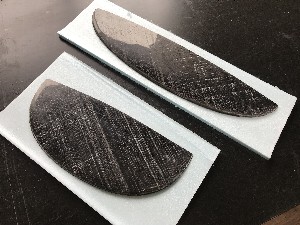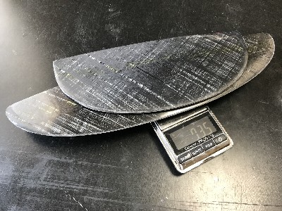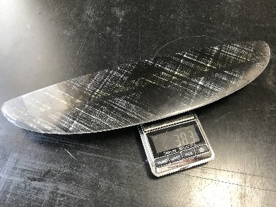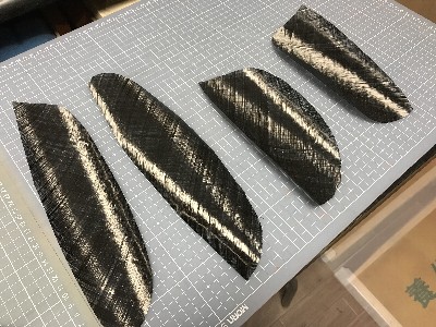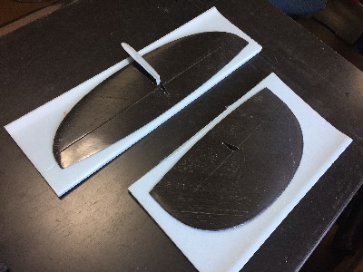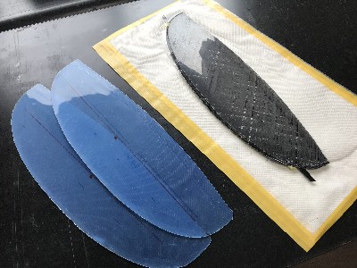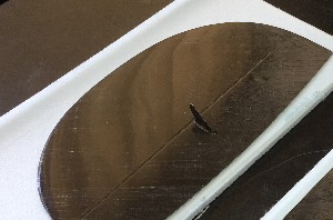 キュア(硬化)後にバギングプバッグから取り出してバギングプレートを外したところ。 DLG機制作において最も自己満足に浸れる時間です。 このあと、前縁、後縁のトリミングを行います。手順としてはまずハサミかカッターで余分な部分をおおよその見当でカットします。 そのあと、エポキシ樹脂の塊がありる場合は#320で、それ以外は#400から#600のペーパーで滑らかにします。 |