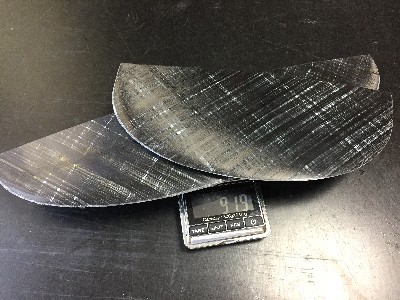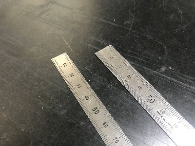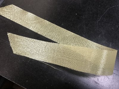 フルカーボンで主翼を制作する際は、ヒンジを仕込んでおく必要があり、 ヒンジは1.0ozのアラミドで製作します。 まず、鋼尺を用いてヒンジを貼るための凹みを作り、凹めた部分にアラミドを貼り付けます。この処理を行っておかないと、仕上がったあとヒンジが出っ張ってしまいます。でも凹み過ぎないように気をつけてください。凹み過ぎると取り返しがつきません。 アラミドの幅は標準15ミリ。軽く作ろうとする場合は12ミリ程度にします。 この幅、鋼尺の幅に影響します。普通に販売している鋼尺は15ミリ幅ですが、どこから見つけたか忘れましたが12ミリの鋼尺ものがあり、これを使用しています。 (写真左側が12」ミリのもの) |