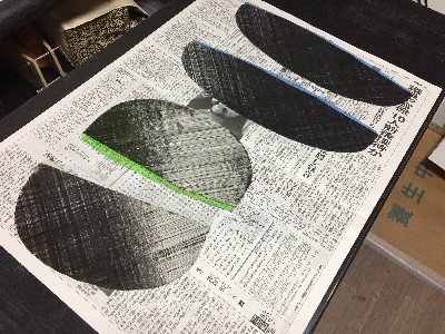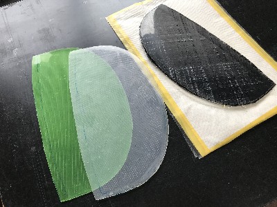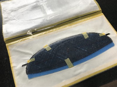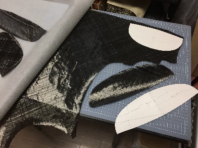 カーボンスプレッドを切り出します。この際に型紙を準備すると便利です。 前縁部分は型紙より少し大きめに切り出して下図のようにセットします。 写真の黒いラインがカーボン、グレーのラインがバギングプレートです |