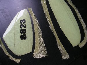 上の写真でヒゲのように両サイドに出っ張っているのはカーボンスパーです。といってもキュア済のものではなく、5ミリ幅のカーボンクロスを割いたものを使用しています。5052樹脂を塗って貼り付けます。 |