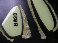 コアへも樹脂を塗ります。 塗布場所は、前縁・スパー部・ホーン部・ブーム接合部・ヒンジライン・後縁。 コアに塗る樹脂もうっかりすると重量増の原因になりますので出来るだけ薄く・・が基本です。 尚、前縁部だけは十分に樹脂を塗った方が、トリミング時に削り易いです。 説明用に古い写真を引用しているのですが、よく見ると左の写真は樹脂の量が多すぎますね、これだと塗りすぎで重くなります。樹脂がついたかつかないか位の感じでOKです。 |
