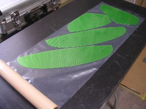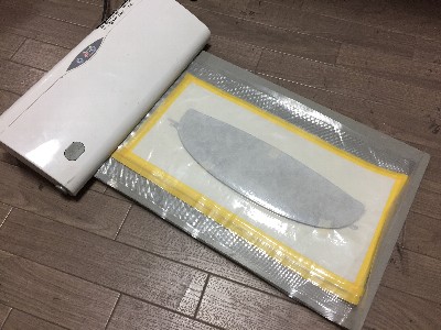 樹脂塗布作業が完了したら、バギングプレートでコアを挟み込みんでリリースフィルムに入れます。 この時、重要なのはコアの前縁とバギングプレートの前縁をピッタリあわせる事。根気良く合わせましょう。コアを整形する時点でコアとバギングプレートの前縁ラインをピッタリあわせておくのがコツです。※写真はバギング後のものですが、バギング前も同じなので代用します。