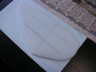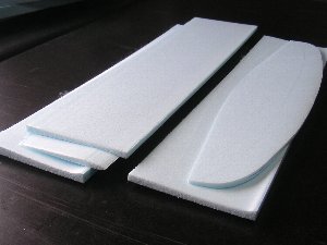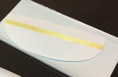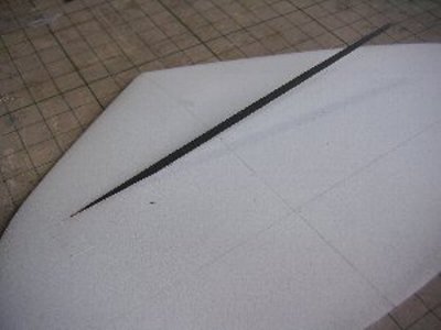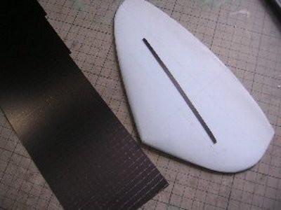 カーボンスパーの割り込み。 スパーは0.15ミリカーボンキュアシートから切り出します。長さは130〜160ミリ。 コアにカッターを入れてスパー差込む切れ目を入れます。(切れ目は貫通させます) |