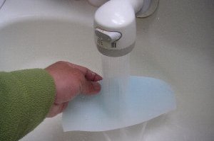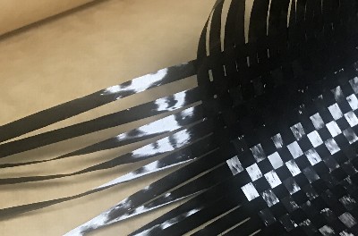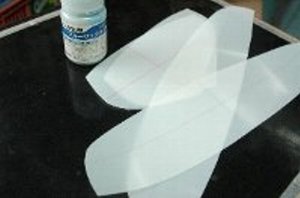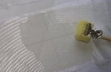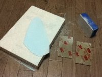 バギングプレートの上にカーボンスプレッドを載せた状態。このあと、エポキシ樹脂をスポンジで載せていきます。写真のように割箸の先に目玉クリップをつけたものを準備しておき、小さく切ったスポンジを挟んで刷毛代わりにすると便利です。スポンジは使い捨てにします。スポンジは腰がなくふわふわなので2つ折りにしてクリップにはさみます。