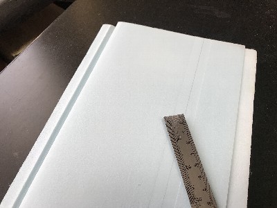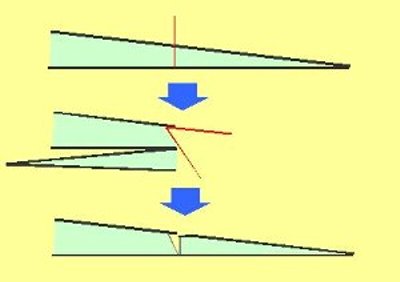 トリミングが終わったらヒンジカット。 カッターで1本だけ切れ目を入れるシングルカット(Vカットレス)ヒンジ。裏面のクロスまで切ってしまわないように注意。 シングルカット(Vカットレス)ヒンジは左のイラストのような工程でカットします。1本目のカットを入れた後、エレベーターを180度折り曲げてカーボンスキンに沿って3ミリ程度のカットを入れます。続いて反対側からカットを入れてコアを掘り出します。 断面が三角形のスタイロ削りカスがでてきます。最後に動翼側のエッジをヘラで潰して完了。 |