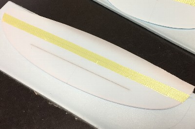 ヒンジには1.0ozのアラミドは大変扱いにくい材料です。特にカットがし難い。ですが、クリアラッカーを吹いておくと写真のように「のりが効いた」ようになり、扱いやすいです。尚、クリアラッカーはエポキシ樹脂を塗った時点で溶けて馴染みます。 尚、垂直尾翼のヒンジは、右利きの方は左側、左利きの方は右側となります。これは、ランチ時にラダーが持っていかれないように、ランチ時にリンケージ(ワイヤー)が引張方向に働くようにすることに起因します。 ラダーホーンの高さはなるべく高くしたほうが、ランチ時の”振られ”が少なくて有利ですのでラダーホーンの高さを稼ぐために(ラダーホーンがなるべく出っ張らないようにする為に)ホーンの反対面にヒンジを取り付けます。これにより右利きの人はホーンが右、その影響でヒンジが左側になるという理屈です。 翼型と平面形が対象であれば気にする必要がありません。ひっくり返して使えるので。でも翼型や平面形が非対称の場合は注意が必要です。