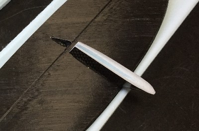 水平尾翼パイロンの拡大写真。 パイロンはスタイロフォームにカーボンクロスを5052樹脂で貼り付けて製作しています。 パイロン内部にはリンケージの通るスペースを作っておきます。 |