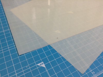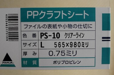最近使用しているのは0.75mmのPP(ポリピレン)シート。関西ではメジャーなホームセンター”コーナン”で入手できます。表面にはバイアス目の柄がはいっていますが、裏面は鏡面ですのでこちらを使用します。 このシートの良いところは サイズ:565x980。これ1枚で3枚のプレートがとれます。即ち、主翼をつくるためには2枚購入する必要があります。 |