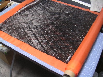 左の写真はCarboline SC39/2/30 繊維が+30°/-30°で配向されています。 オレンジのは養生用の布で、これにくるんで送られてきます。以前はクラフト紙でしたが、昨年途中より布に変わりました。 Carbolineはデリケートなのでカーボン繊維だけで取り扱うととほつれるケースがありますのでこの布が必須です。 |