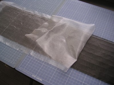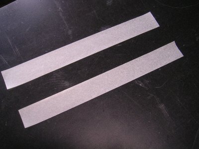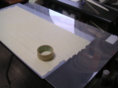 テープ状にカットすると繊維がほつれて難儀しますので、これを防ぐ為にマイクログラス(なるべく薄いもの)を貼り付けておきます。貼り付けはスプレー55を使用します。 スプレーのりはカーボン側に吹き付けた方が貼りやすいでしょう。 |