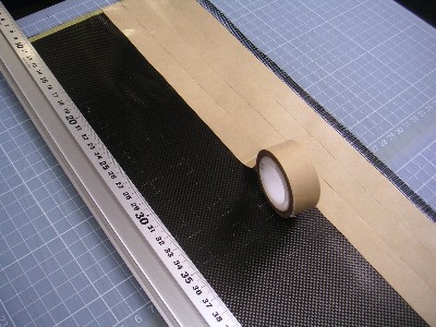 説明が前後しますが、前縁用のカーボンテープの準備。 その都度作るのが面倒なので一定量をまとめてを準備します。 2.7 oz/yd2(92g/m2)のカーボンクロスに3M 極薄両面テープ(型番: 467MP、厚さ:0.05mm)を貼ります。両面テープは写真のように詰めて貼って、後でにテープ状にカットします。 ちなみに、最終的に前縁部分は削り合わせしますのである程度の厚みが必要。SAカーボンのように平織りのものではなく、通常の撚り糸タイプの方がベターです。 |