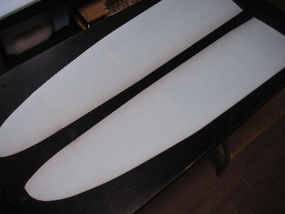 Carboline単体だとピンホールが多くできてしまうために薄紙をオーバーレイします。薄紙貼りにすることでピンホールが無くなるのはもちろん、鏡面仕上げにできます。 写真の製品は梱包用(引越しの緩衝材)をビルダーのM氏が大量仕入れしたものを少量わけて頂いたものです。この材料は巾900mm程度ありますのでジョイントせずに使えます、重量は実測値:約14g/m^2 手に入りやすいのは江崎模型のPLYSPANです。PLYSPANは重量12.8g/m^2、サイズ450mm X 600mm。PLYSPANはカラーのものもあってきれいですがカラーの場合は紫外線で褪色するので最近は無地のものを使用しています。無地のものは樹脂を含浸させると透明になります。 しかーし、欠点があります。雨に濡れると紙繊維が湿気を吸い込んで白濁してしまいます。同時にツヤも無くなってしまうので、古臭いかんじになります。これを防ぐためにバギングプレートにクリアー塗料を吹き付けて転写します。これによりクリア塗料層ができて薄紙表面がコートされます。(手間がかかります) |