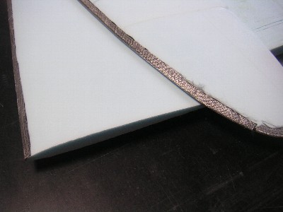 コアはコアカット時の熱の加わり方の関係で前縁と後縁部分がウイングスパン方向に微妙に縮む傾向があります。 コア接合前にサンディングブロックで小口面の面出しを行います。 この際、力の分布が異なる関係で後縁の方が多く削れてしまう傾向がありますので注意が必要です。 |