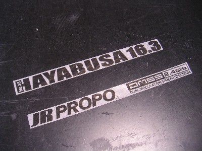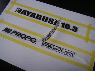 HAYABUSAのネーミングは無地の薄紙にインクジェットプリンターでプリントします。 この薄紙は先に説明したものと同じものです。江崎模型のPLYSPANでもかまいません。また、身近にあるものとしてはティッシュペーパーも使用できます。 写真のように短冊状に切り出してA4の台紙(普通のプリンタ用紙)に貼り付けてプリントします。 |