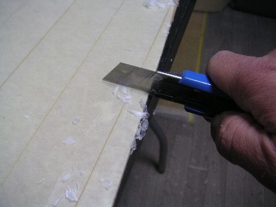 バギング時に前縁部分を添わせやすくする為に、前縁10〜15mm位の部分をテーパー状に薄くします。 削り方は左の写真のように大型カッターを垂直に立ててガリガリと削ります。この方法が一番楽です。 この際、プレートを押さえる為に添える左手をカッターで切ってしまうことがありますので、お気をつけください。私は2回も左手をカッターで刺した経験があります。 |