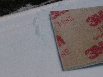 接合が済んだら、サンディング。まず、表面に残された細かいヒゲを削り落とします。 先に#180程度のペーパーで荒削りしてから番手を落とします。 仕上げには3Mのスポンジペーパーが便利です。適度な柔軟性があって、3次元曲面にもフィットします。 番手はFINE(#240〜#320)を使用します。 |